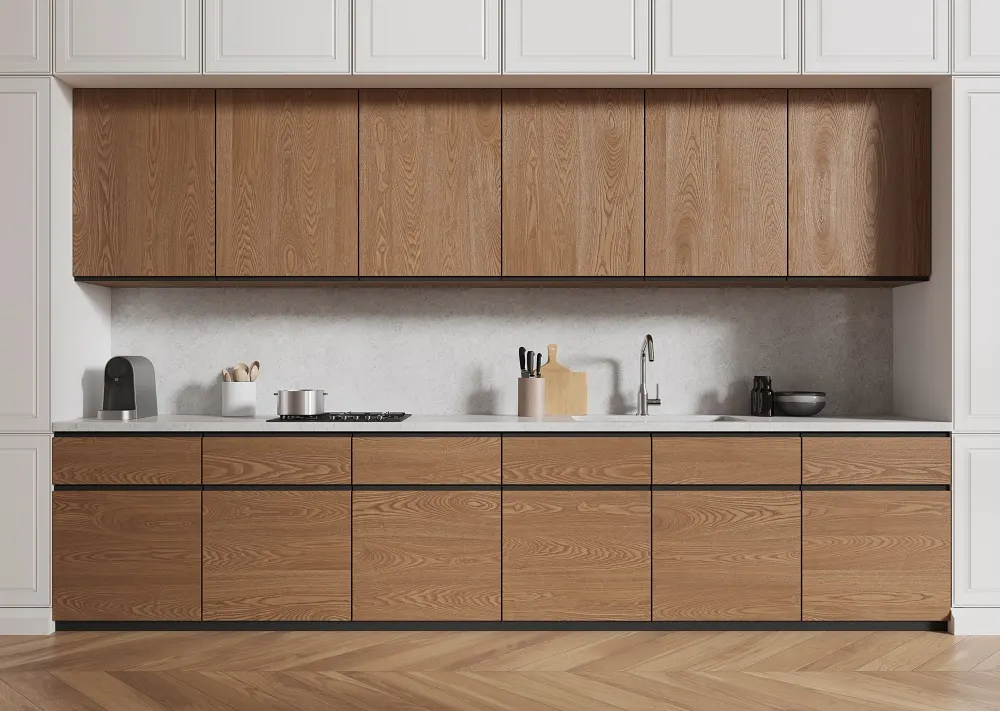 Your cabinet doors start with a solid core, usually MDF or particleboard, that's wrapped in this advanced thermofoil material using heat-activated adhesives and vacuum pressing. A protective topcoat seals the surface to create cabinets that handle daily kitchen demands while maintaining their appearance for decades. The result is a seamless, durable finish without visible edges or joints.